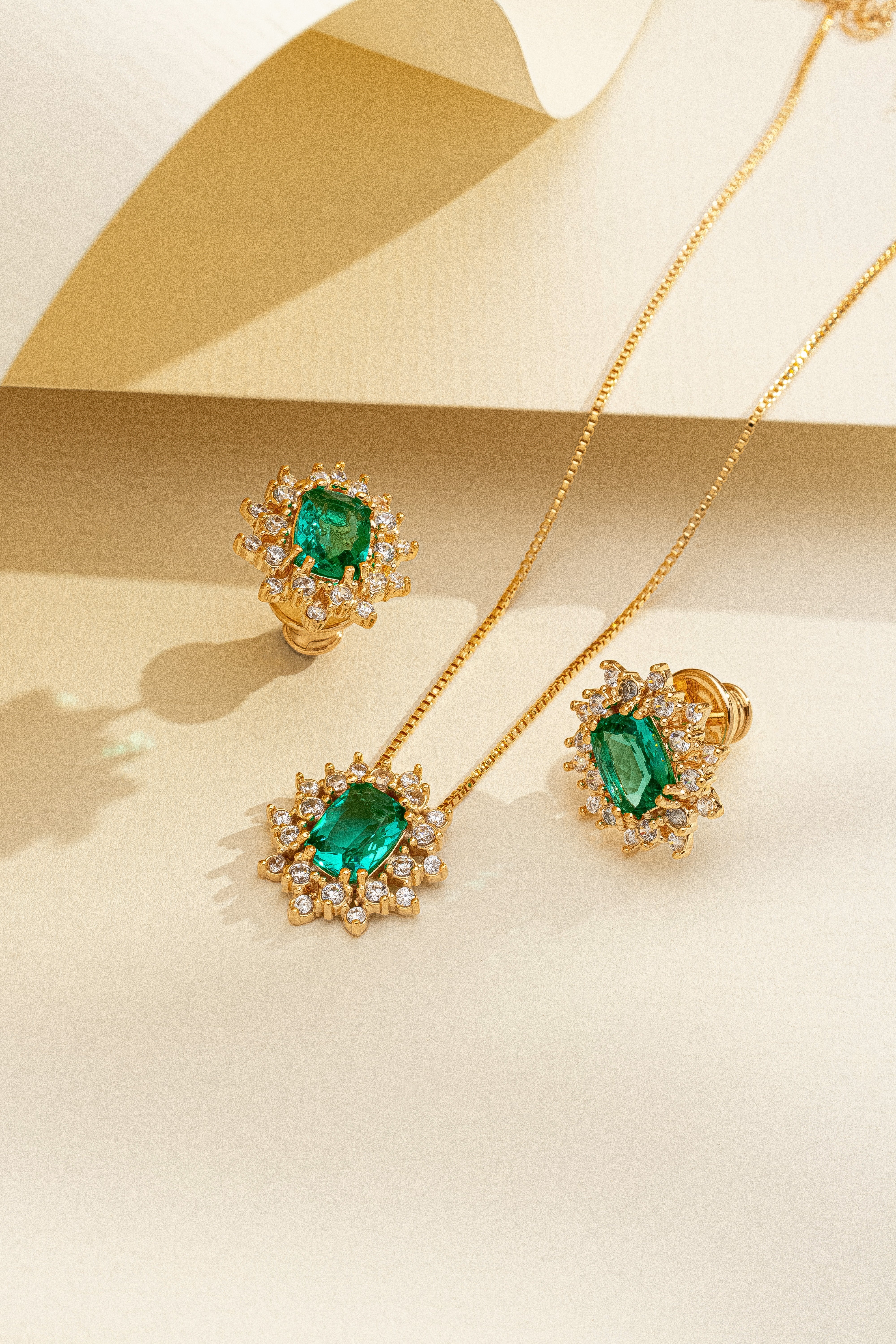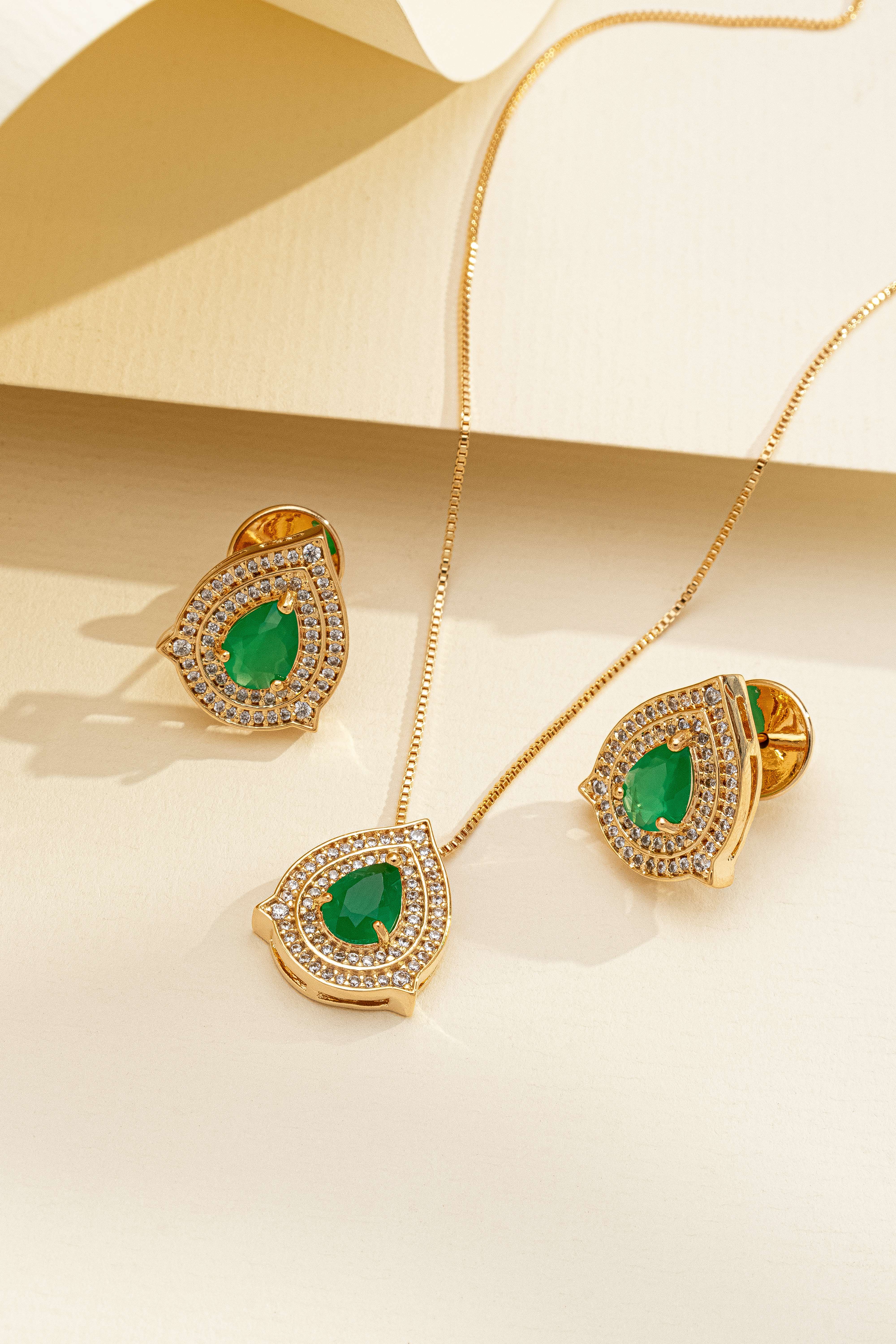 Conjunto de Anel e Brincos Retangular com Zircônia Verde