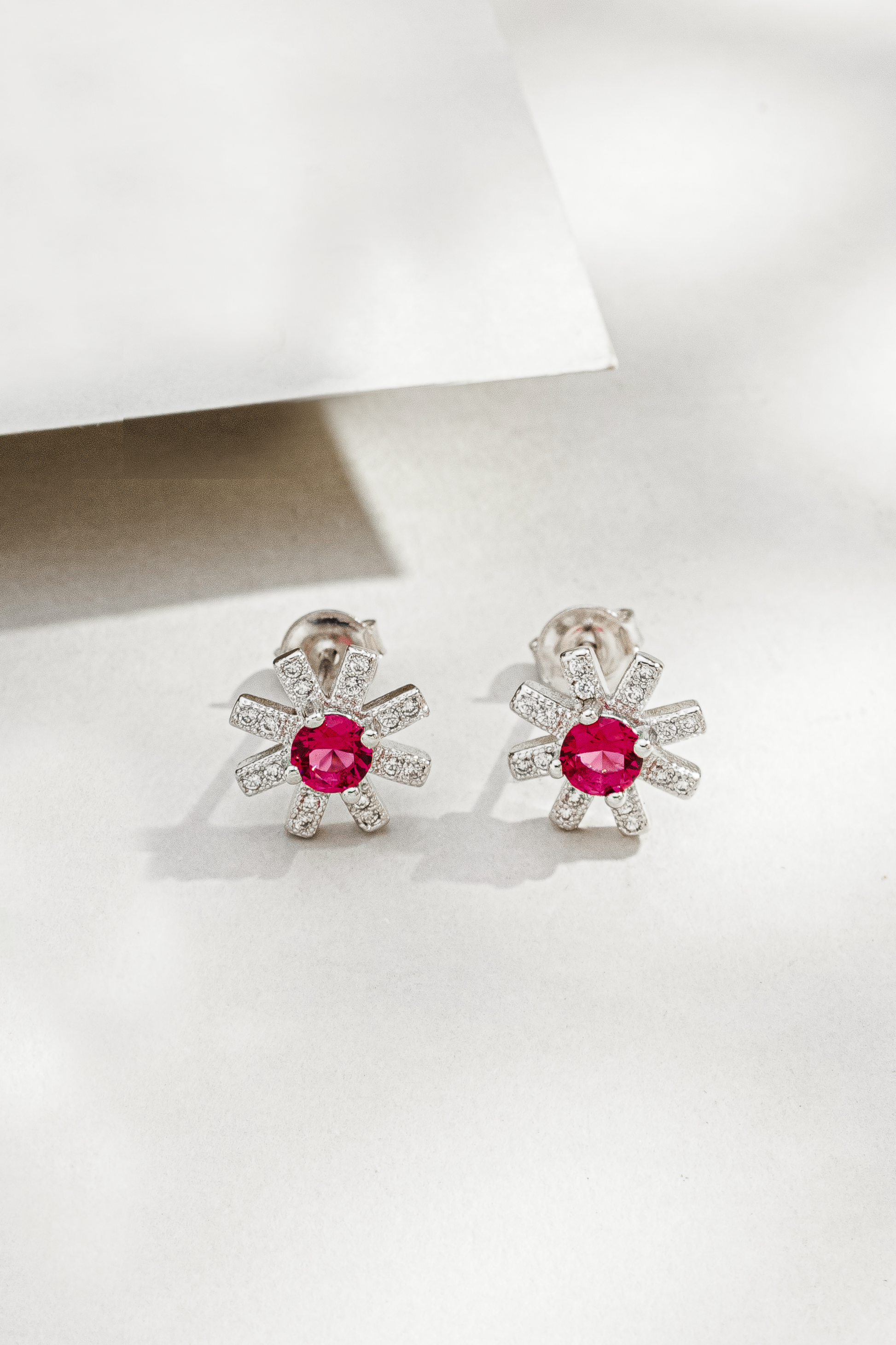Design: Estrutura em formato de flor com pétalas alongadas e cravejadas de zircônias, valorizadas por uma pedra central em destaque que traz um toque vibrante e delicado à composição.