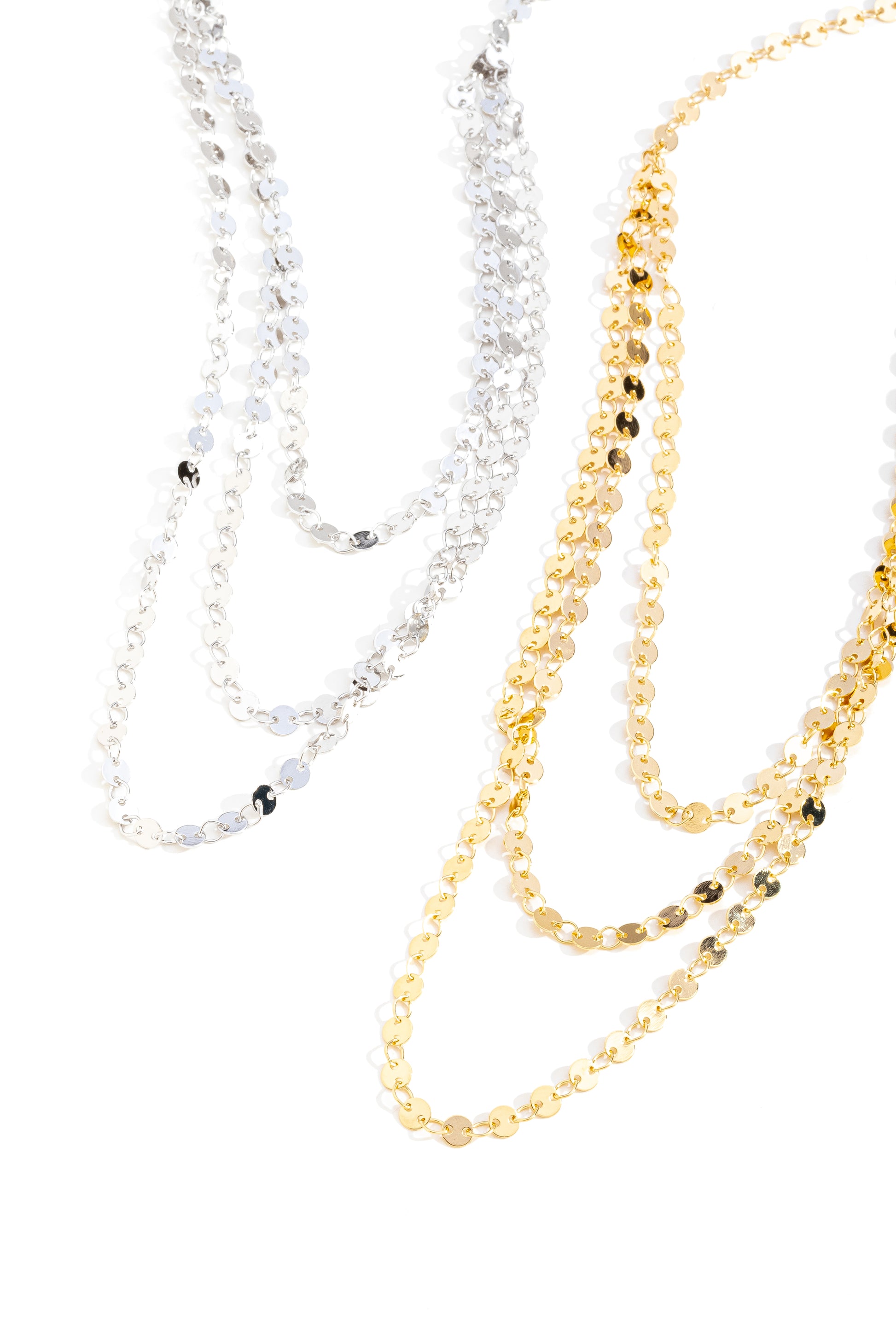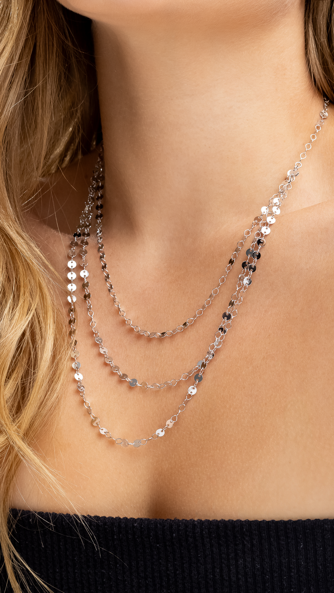A Corrente Disco Tripla é sinônimo de brilho e elegância. Seu design em três camadas fixas cria um efeito sofisticado e moderno, com discos polidos que captam a luz a cada movimento. Uma peça que ilumina o colo e traz leveza ao visual.